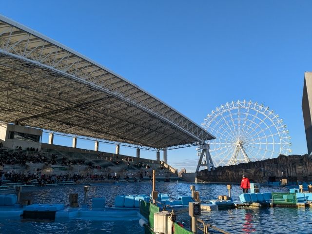 シャチやベルーガの水槽から上へ進み屋外に出ると、最大水深12mの「メインプール」が見えてきます。周りには座席がずらりと並び、約3,000人収容のスタジアム。