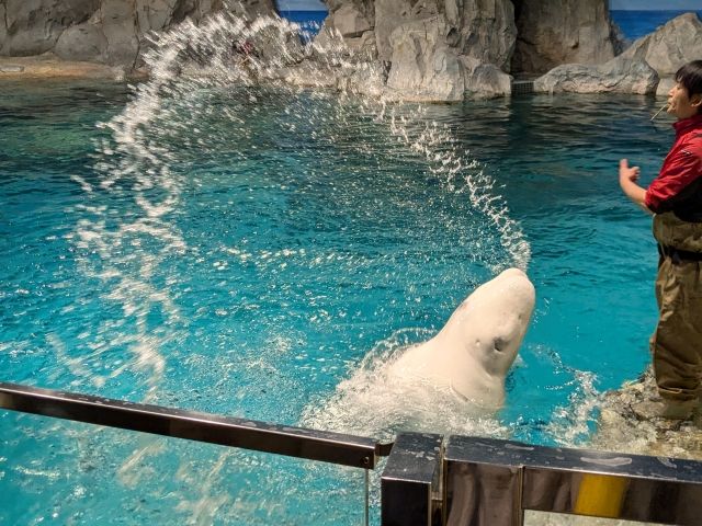 4頭分のフルボリュームの鳴き声が室内に反響して、それはそれはダイナミックなオーケストラに。そのため、スタッフさんの解説の声があまり聴こえないことも・・・。でも元気いっぱいなベルーガを見ることができて、ほっこりしました。どんな鳴き声か気になる方は、ぜひ現地を訪ねてみてくださいね!