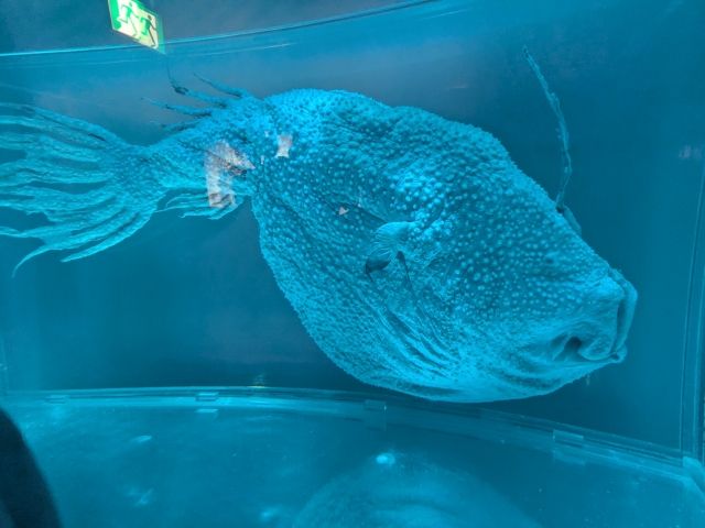 特に注目は深海魚の標本。こちらはビワアンコウのメスの標本。ビワアンコウのオスはメスよりもずっと小さく、メスの体に寄生したのち血管もつながり一体化してしまうという非常にユニークな生態。もしかしてどこかにオスが付いているのではと探してみたのですが、この標本にオスはついてないそう。