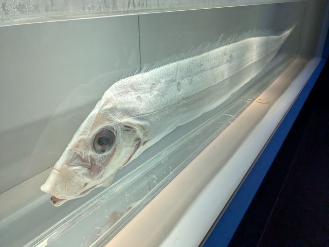 この長いサカナはリュウグウノツカイでもサケガシラでもなくテンガイハタ。体長は3mにも及ぶ大きなサカナで、上記2種と同じくアカマンボウ目に属しています。2002年に和歌山県の定置網にかかった個体であるそう。
