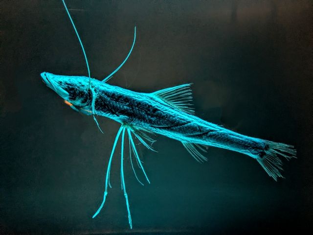 エキセントリックなフォルムのイトヒキイワシ。長く伸びた腹ビレと尾ビレで海底に立って静止するという変わった生態を持っており、その姿から三脚魚とも呼ばれています。泳ぐことなく止まっている理由は、エサの少ない深海で余計なエネルギーを消費しないため。広げた胸ビレが流れ着くエサを感知するアンテナとなっています。