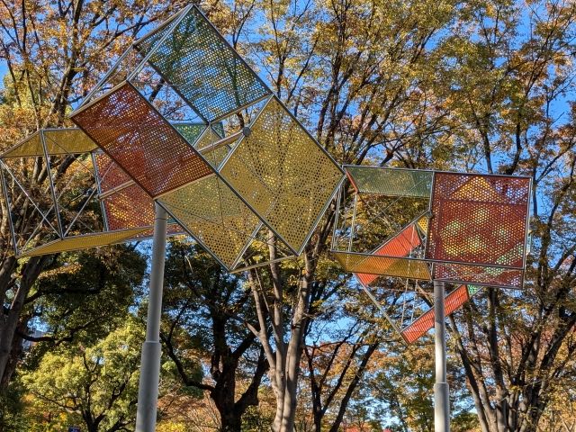 木々に溶け込むカラフルなボックスは《風のまつり》by 新宮晋。風を受けるとゆっくりと回転する、動きのある作品です。名古屋駅に設置されていたものを移動したそうです。