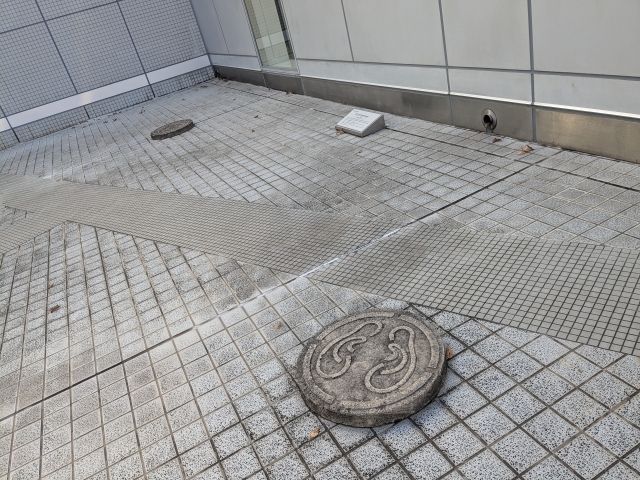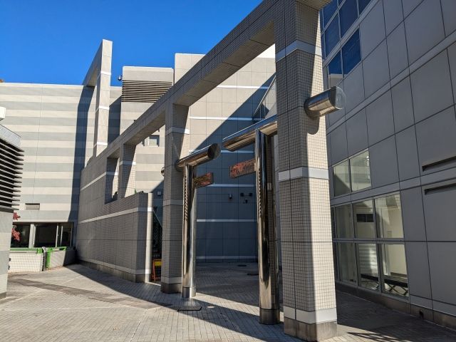 コンクリートプレートに記されたフットマーク、こちらは《点音》by 鈴木昭男。ここに立ち、周りの音を聴くという体感型のアート作品。耳を澄ませると、落ち葉が風に舞う音と鳥の声、人の話し声、遠くに聴こえる車の音・・・。これらが建物に反響して爽やかなハーモニーを奏でます。
