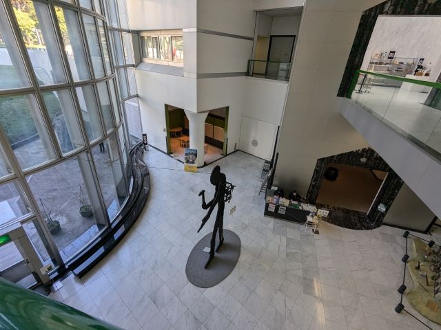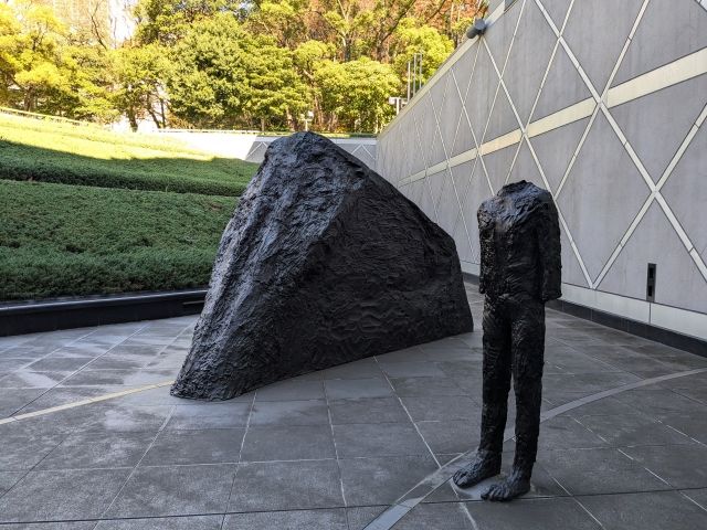 地下一階部分の広場にある、《智者の頭》《黒い立像》という2つの作品は、ポーランドの彫刻家アバカノヴィッチ・マグダレーナによるもの。人型の作品は首のない姿ですが、後ろは空洞となっています。背の高い人なら、彫刻をまとった姿になることもできそうです。