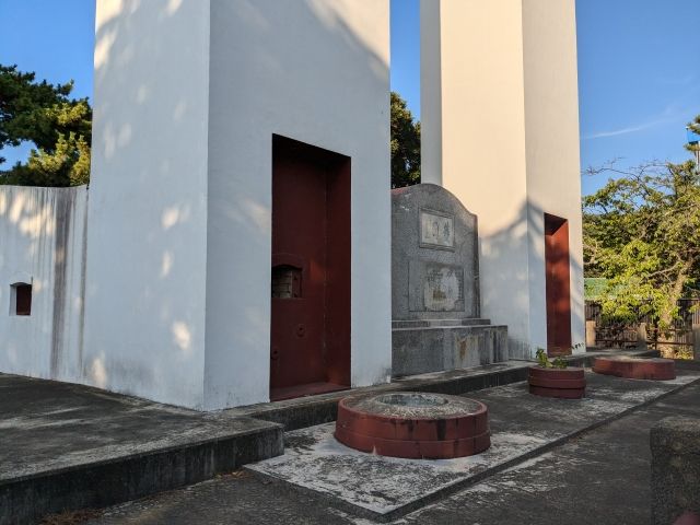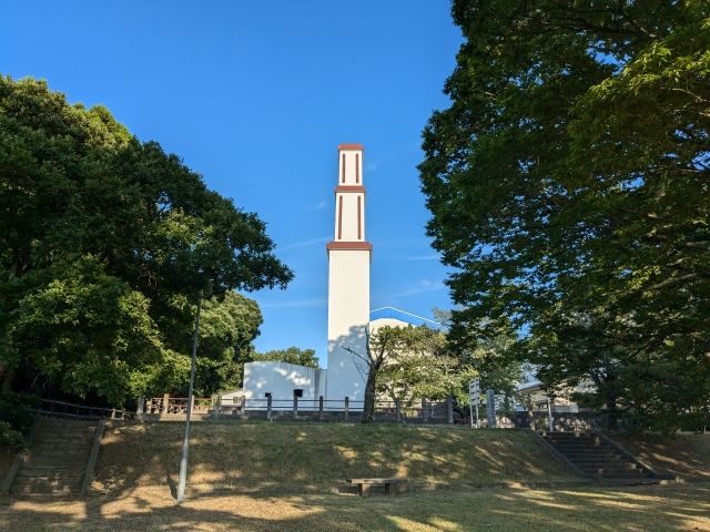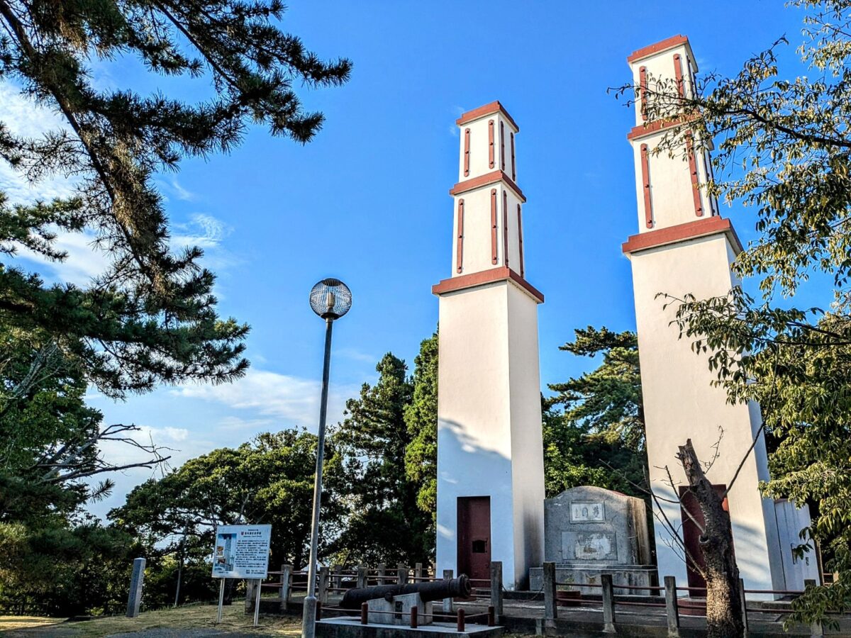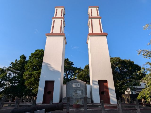 こちらが那珂湊反射炉。登った先からは1本の塔に見えますが、正面から見ると、真っ白く輝くツインタワーの姿。その高さは約15mにも及びます。