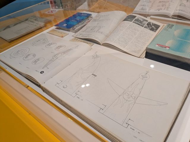展示は、万博の建築物を平面図や立面図、写真とともに解説しているスタイル。