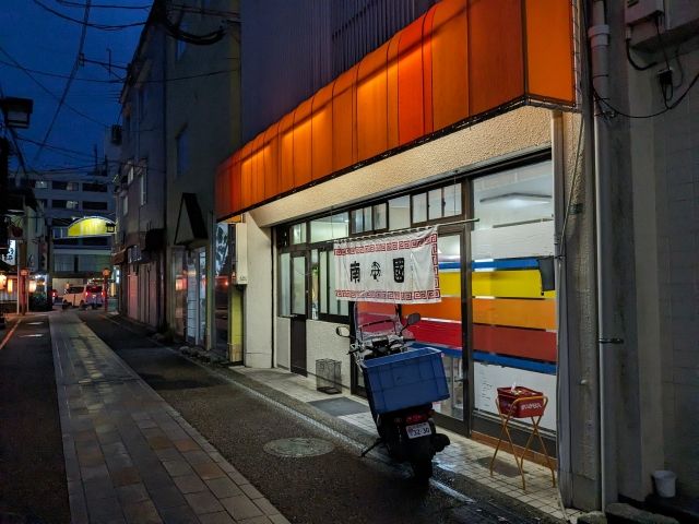 「南国」は、繁華街の中にあります。オレンジの軒先テントと、カラフルに仕上げられたガラス戸が独特の存在感。