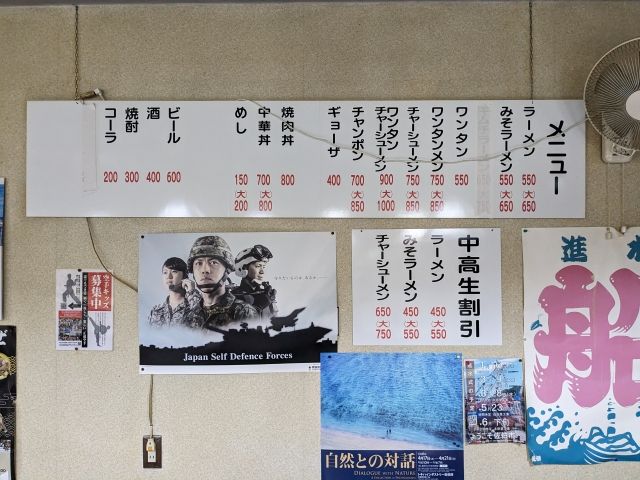 メニューはいたってシンプル。「ラーメン」「みそラーメン」「ワンタンメン」「チャーシューメン」「チャンポン」などが揃っています。「ギョーザ」に加えて「焼肉丼」なんてメニューも。ちなみに、「ライス」ではなく「めし」という表記が凄く良いです。