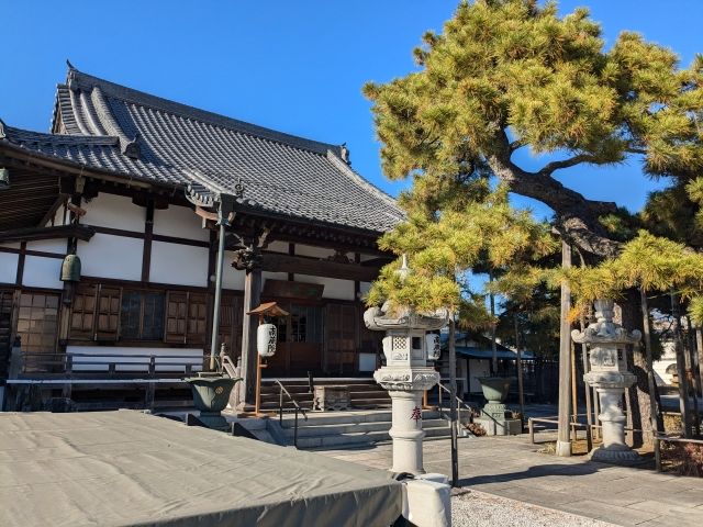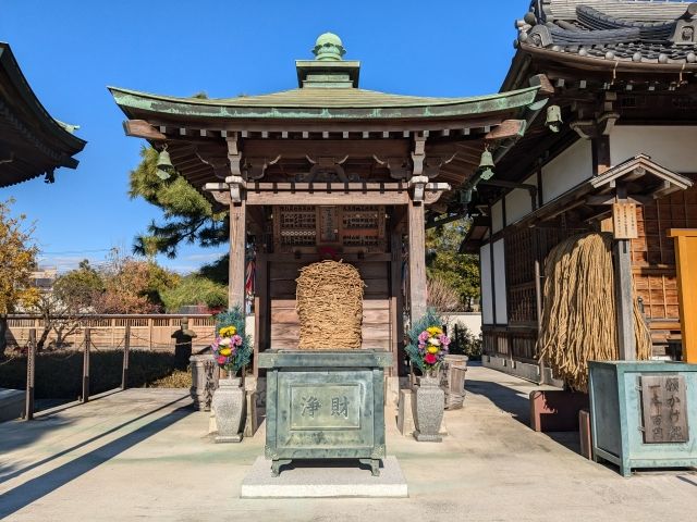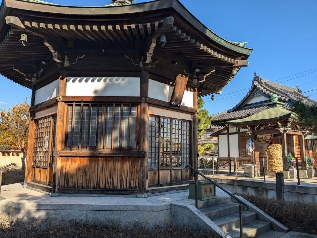本堂のそばに建つ聖徳太子堂。聖徳太子を本尊として祀るお堂で、法隆寺の夢殿と同じく八角形の建築です。