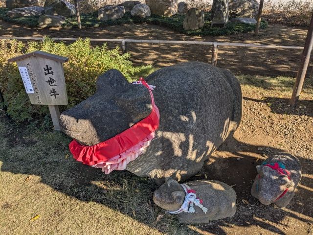 横たわる牛の石像、この牛は乗っても良い牛。またがると出世のご利益があるため「出世牛」と呼ばれています。乗ってみたのですが、けっこう大きめなのでちょっと股がきつめです。
