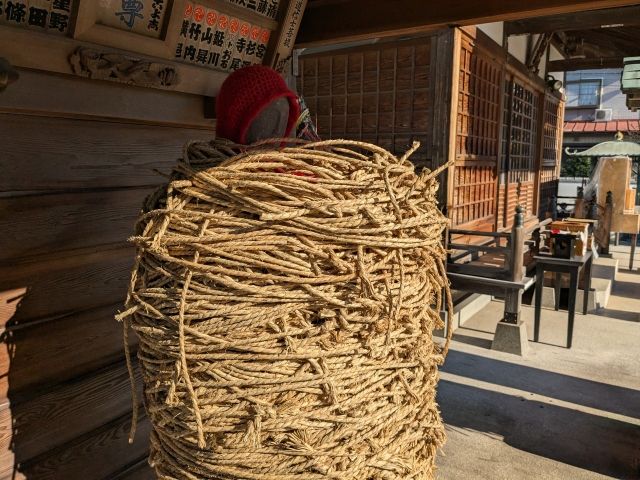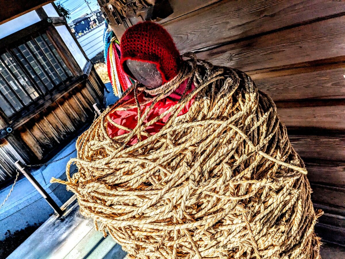 この縄の塊は、なんとお地蔵様。ぐるぐる巻きで何重にも縛られており、「縛られ地蔵」と呼ばれています。
