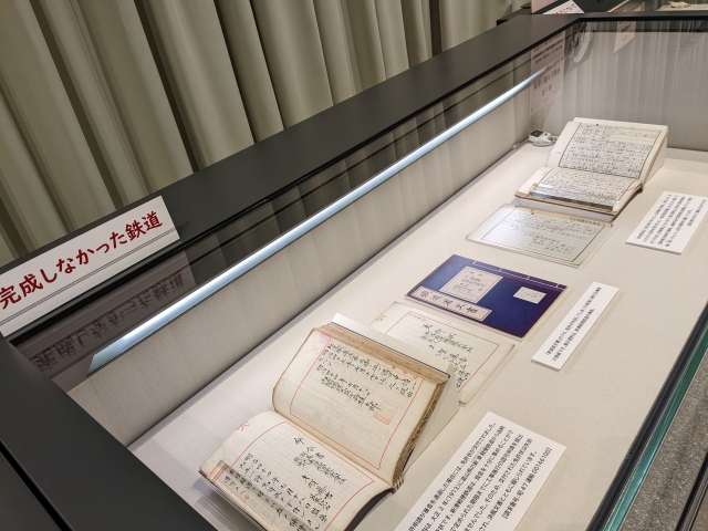 興味を惹かれるのは計画されながらも実現に至らなかった「幻の鉄道」。資金不足で頓挫した新湊軽便鉄道の免許状、業績不振などにより一部区間しか開業できなかった武州鉄道についての文書が展示されていました。