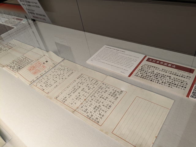 展示室に並んでいたのは、「民撰議院設立建白書」、「国会開設の勅諭」、「教育勅語」、「日清講和条約」、「日露講和条約」などなど。いずれも歴史の教科書で見かけた名前ばかり!関東大震災や二・二六事件の記録などもあります。