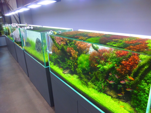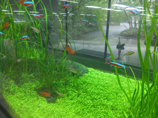 どの水槽も、とにかく緑があざやか。デザインされて植えられた水草は、まるで新緑の草原のようです。