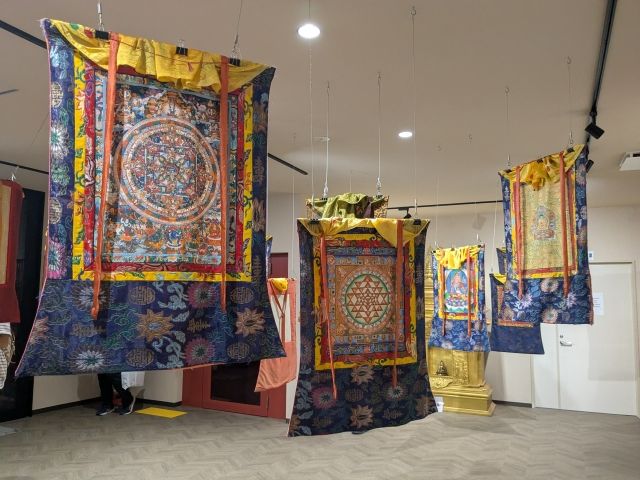 吊るされている華やかな織物。おそらく曼荼羅ではないかと思いますが、詳細は不明。
