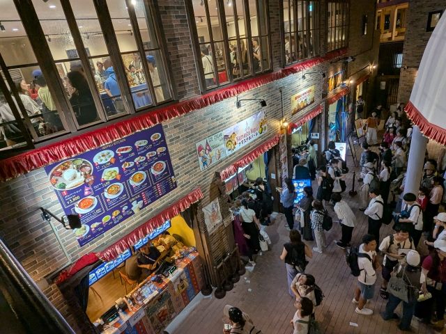 門をくぐると、そこに広がるのは多数の飲食販売やショップコーナー。まるで屋外フードコートのような状態で、情報処理が追いつきません!!