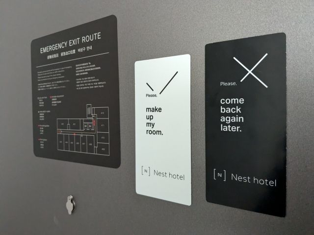扉に貼られた2つのマグネット。連泊の場合、白い方を外に貼ると「清掃あり」、黒い方を貼れば「清掃無し」で対応してくれるそうです。