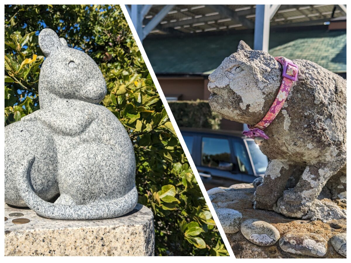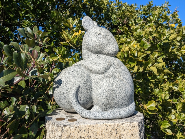 石碑の上にちょこんと乗っているのは、ねずみの像。何か玉のようなものを抱えたており、なんともかわいらしい姿。キレイな花が添えられており、きちんと清掃されています。