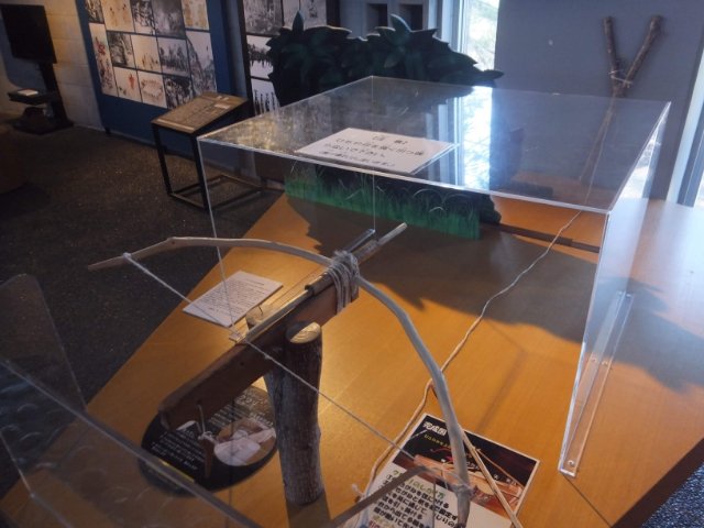 こちらはクワリと呼ばれる仕掛け弓。手順にしたがって弓矢とヒモをセットします。下にある輪っかを引っ張ると左奥からクマがぬーっと出現。クマがヒモにひっかかると、バシュッと矢が飛びクマを狙い撃ちに!本当に矢が飛びます!