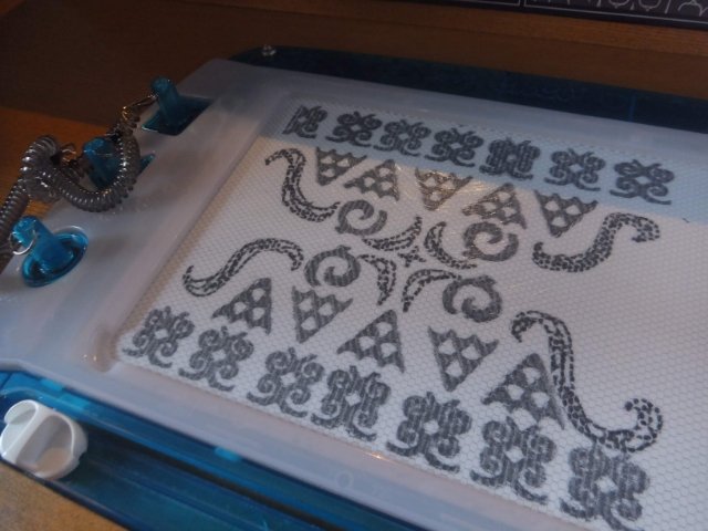 一見すると、凄くがんばって描いた様に見えますが、実はスタンプがアイヌ仕様に改造されています。並べて押すだけなので、誰でも簡単に描くことができます。