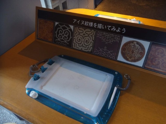 「アイヌ紋様を描いてみよう」コーナーでは、なつかしの磁石のお絵かきボードが設置されています。せっかくなのでやってみよう!