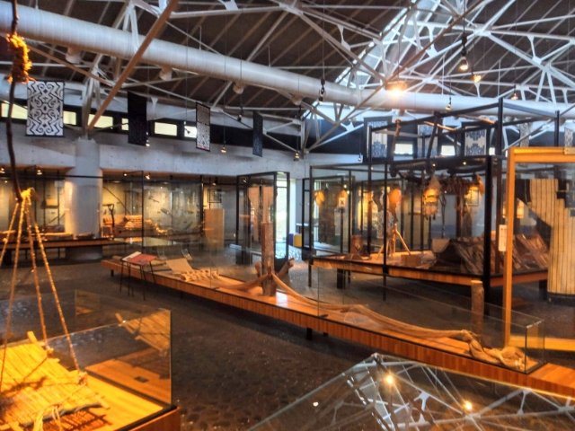アイヌの聖地、二風谷(にぶたに)の湖畔にあるアイヌ博物館。きれいな館内には、アイヌの道具や工芸品など様々な展示がびっしりと並んでいます。屋外の再現住居と合わせて、どっぷりとアイヌ文化に浸れる場所です。