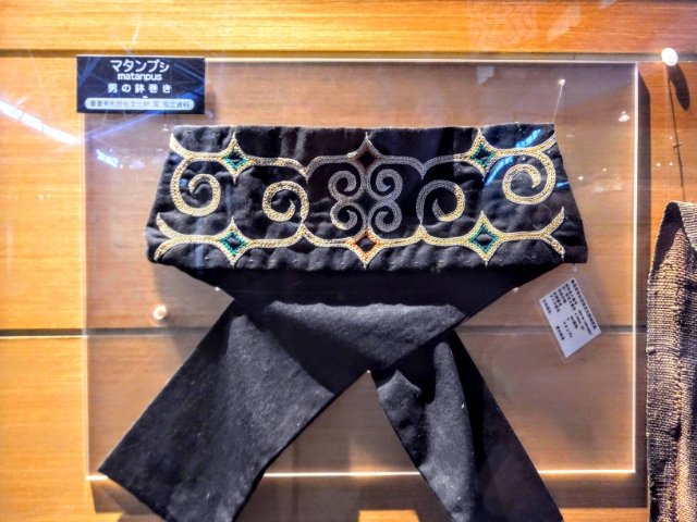 こちらはマタンプシという鉢巻き。髪を結ぶことがないアイヌにとって、狩りなどの作業を行う際に髪の毛が邪魔にならないように、この鉢巻きを巻いてまとめていたそうです。