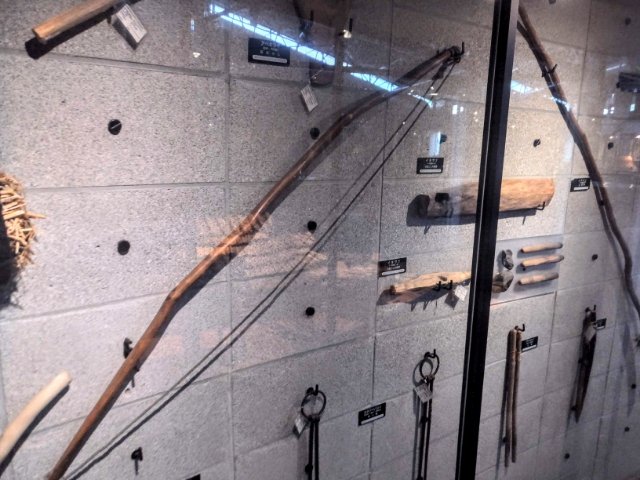 狩猟採集民族として知られているアイヌ。ここには、狩りに使用していた弓矢や矢筒・小刀といった道具がたくさん並んでいます。