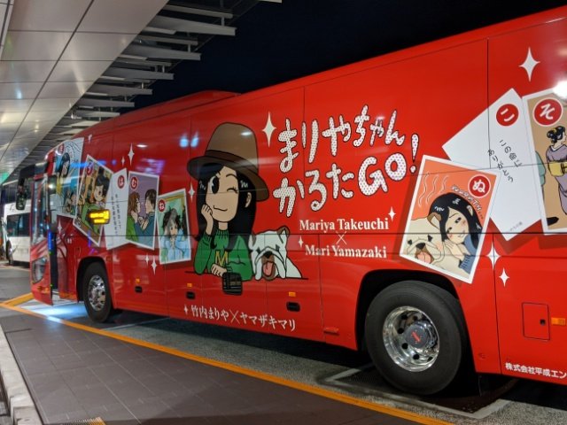 今回乗車するバスがやってきました!竹内まりや×ヤマザキマリの「まりやちゃん かるたGO」でラッピングされた派手なバス。窓は完全にふさがっています。