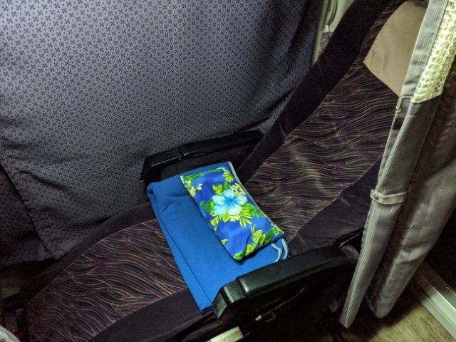 こちらが今回選んだ10C席。進行方向右側の最後列です。フットレスト、レッグレスト、ブランケット、クッション、コンセント、ハンガーが標準装備。また、各座席にはしっかりプライベートカーテン付き。最後列の席なので、シートの後ろにはちょっとだけスペースもあります。