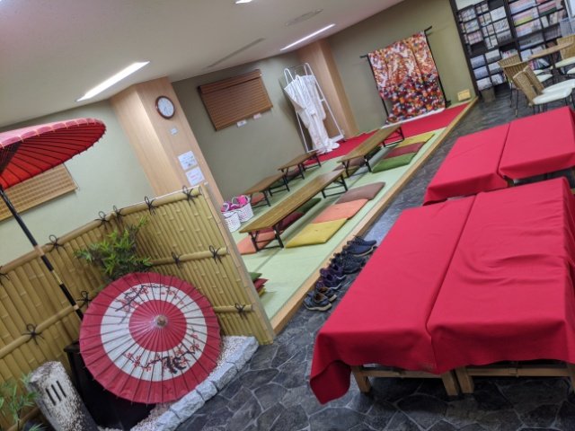 京都VIPラウンジには2階もあります!こちらのフロアに乗車待ちの人はいないためか、かなり空いてます。和傘や畳が京都らしい演出。