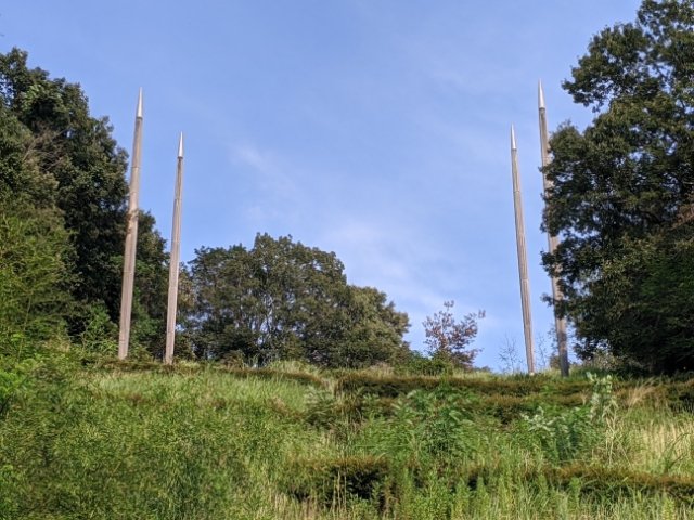 テラドームの左奥へ進むと、高く伸びた4本の柱、「日本のへそモニュメント」が見えてきます。