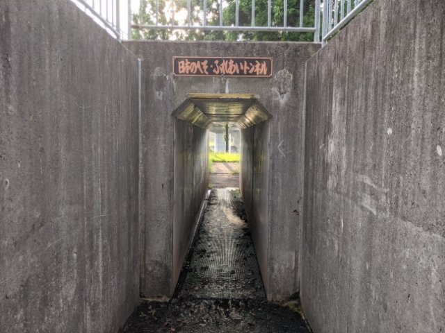 日本のへそ・ふれあいトンネルと名付けられた線路下の道を進みます。たしかに、すれ違ったらふれあいそうな横幅です。