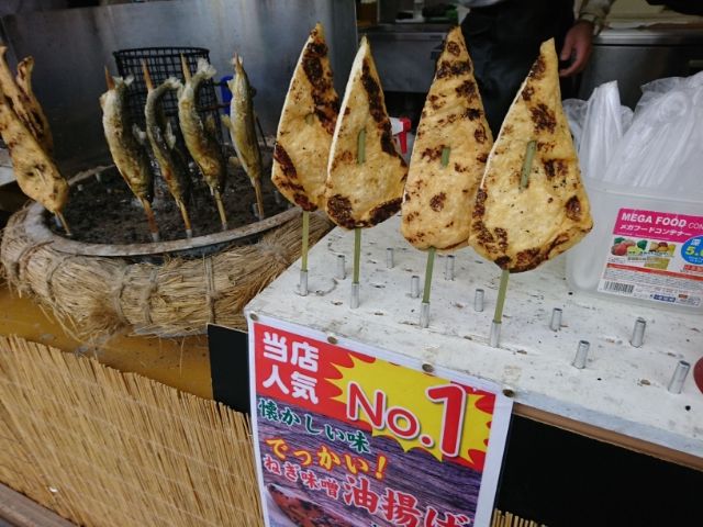 というのは嘘でお腹が空きました!菊人形会場には屋台や食事処が何軒か並んでいます。大きな「ネギ味噌油揚げ」を食べ歩きしながら駐車場まで戻りました。