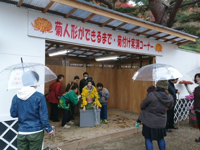 進んでいくと「菊人形ができるまで・菊付け実演コーナー」を発見。ここでは、実際に人形を菊デコする現場を見学することができます。園内の菊人形は、たった6人で行っているそう。これだけの規模、いったいどれほどの時間がかかっているのでしょうか。
