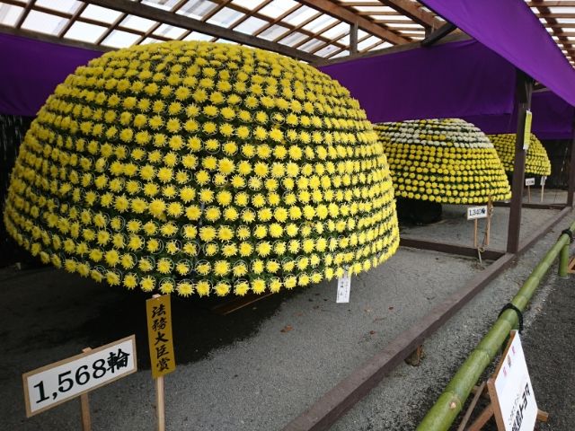 「大多輪の部」では、千輪咲といって、1本の茎から枝分かれさせ、たくさんの花を咲かせた菊の姿が。こちらはなんと1,568輪咲きというとんでもないボリュームの菊。菊の仕立てについて全く知識がなくても凄いとわかる圧倒的な数字の力、ここにたどり着くのにどれだけの努力があったのでしょうか。