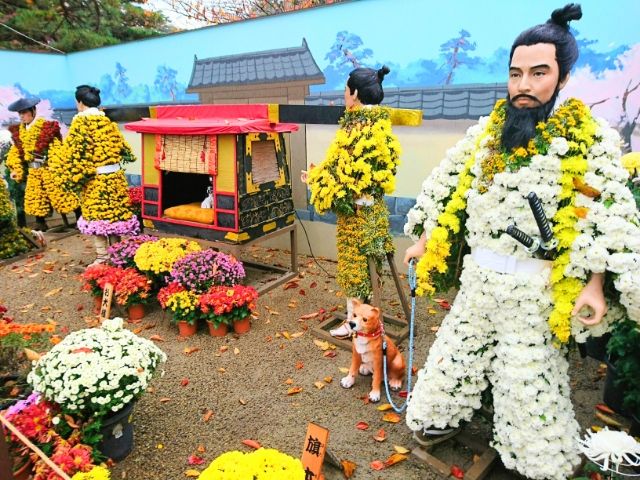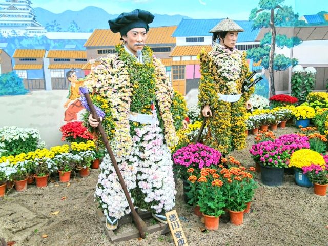 菊でデコられた江戸幕府初代将軍・徳川家康。シックな色合いの菊は渋い表情の家康にぴったり・・・・