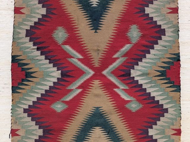 展覧会のポスターにもなっている、北アメリカ先住民ナバホ族の「ブランケット」。鮮やかな色彩と、不思議なデザインで目が錯覚しそうです。