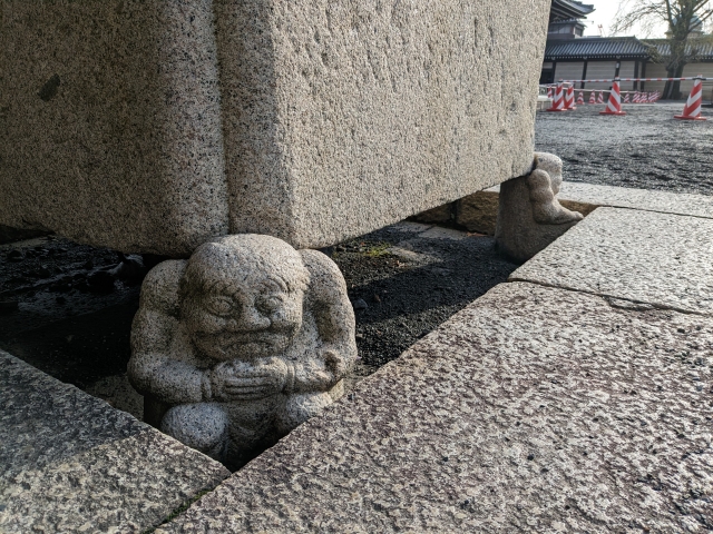 雨水を受けるための天水受けを支えるように置かれているのは天の邪鬼。御影堂が再建された1636年より、約400年もの間この天水受けを支えているそうです。