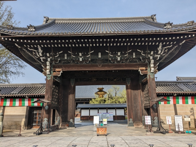 立派な御影堂門(ごえいどうもん)が境内への入口。西本願寺は拝観料が必要なく、無料で開放されています。