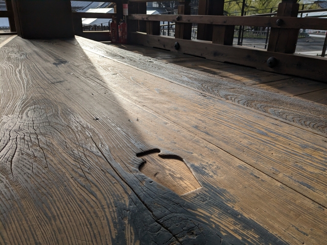 埋め木というのは木材の割れ目などを修復するために挿入された木片のこと。木造建築では珍しいモノではありませんが、ここ西本願寺の埋め木はなかなかユニーク。なんと、「とっくり」のカタチをしています。