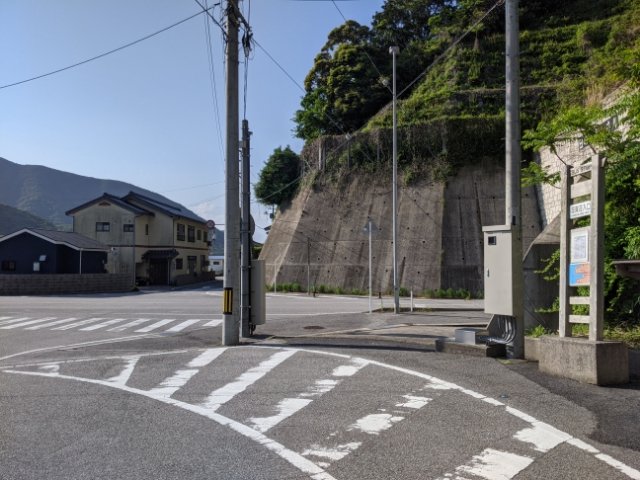 最寄りのバス停は《国賀荘入口》。写真右手前がバス停、左奥のクリーム色の建物が民宿。これくらい目の前にあります。