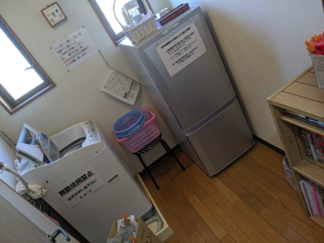 洗濯場には洗濯機と冷蔵庫。洗濯機は1回200円とのこと。割り箸、ボディスポンジ、マンガ雑誌なんかもあります。