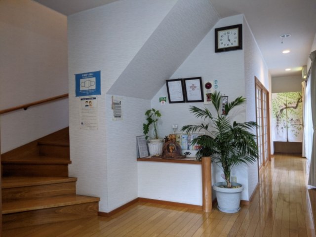 玄関のドアを開くと優しそうな女将さんが出迎えてくれます。1階が食堂で、客室やお風呂などは全て2階にあります。