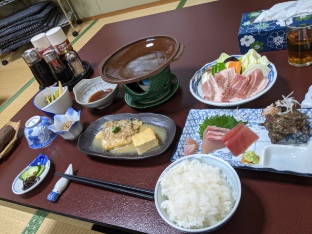 さて、待ちに待った夕食タイム!今回の旅はずっと車中泊続きだったので、いつも夕飯探しは悩みどころでした。決まった時間にお料理が用意されているのはとってもありがたい。