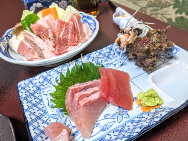 本日のメニューは、ヒラマサ・マグロ・サザエのお刺身、豚バラ焼肉、ヒラマサのあら汁、サバの味噌焼きなどなど。民宿とは思えないほど手の込んだメニューです。サザエって刺身で食べるの初めてだったのですが、とっても美味です!