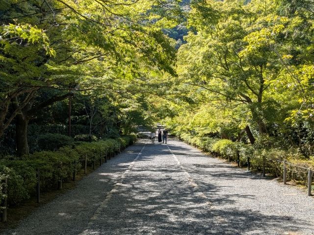 受付からはまっすぐに伸びる参道。9月に訪問したところ青々とした木々に包まれた姿。ここはサクラとモミジが交互に植えられています。紅葉の馬場と呼ばれており、秋の紅葉シーズンにはそれはそれは美しい姿に。