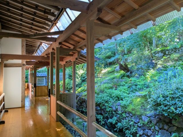 この縁側、本堂の裏側まで続いています。進んでみるとぴかぴかの廊下。迫るように見える斜面は小倉山であり、6体の六地蔵菩薩が隠れています。
