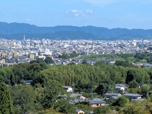 時雨亭跡の目の前は木々が開けた展望台。京都タワーがそびえ立つ京都中心部を一望できて、とっても爽快!山を上った感覚はほとんどありませんが、謎の達成感に包まれました。