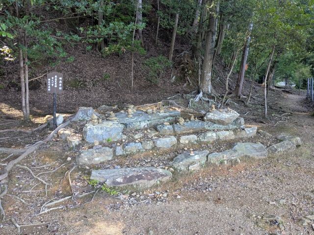 気軽に向かってしまいましたが、いったいどれくらいかかるのか。この先に山登りがあったりしないか不安になった瞬間、見えてきたのが石積み。こちらが時雨亭跡です。湛空上人廟からわずか2分ほどでした。